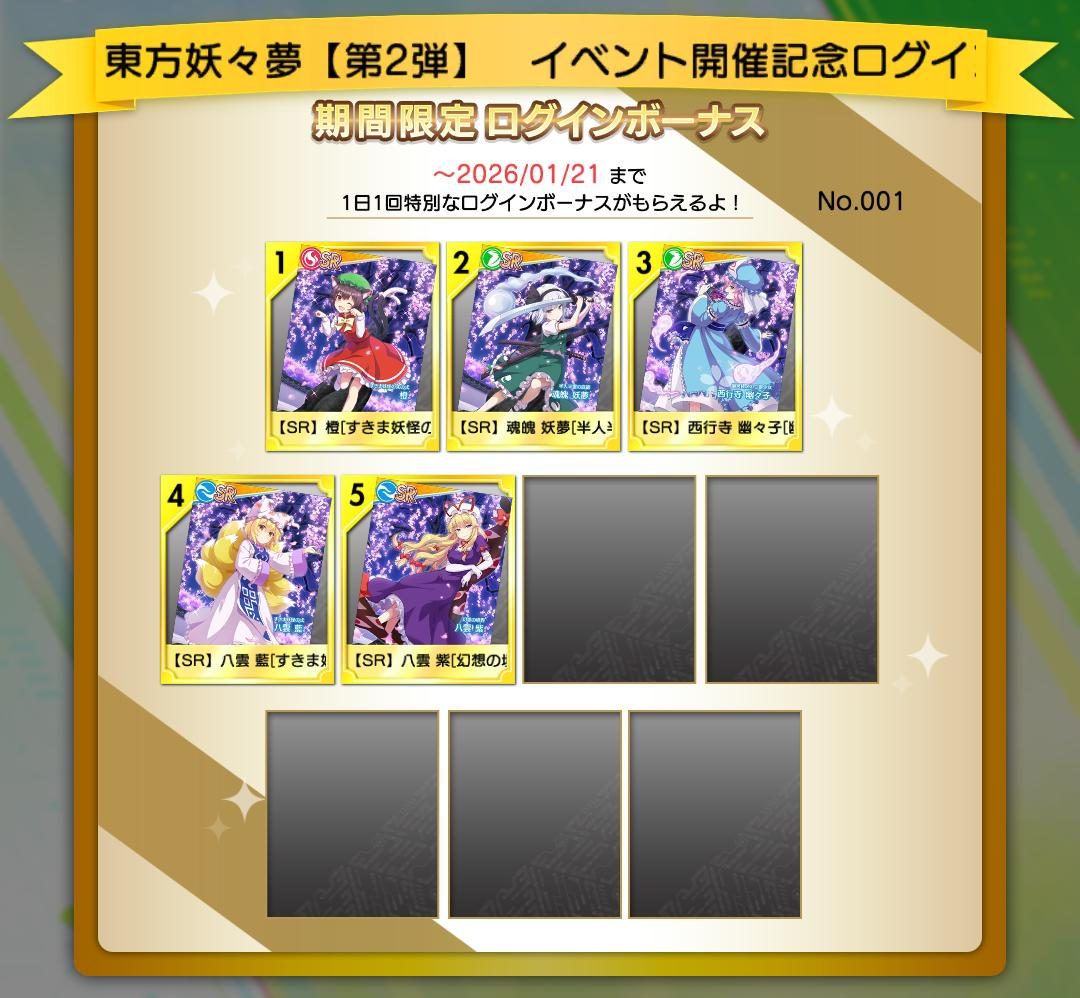 | 5日目 | 【SR】八雲 紫[幻想の境界]×1 |