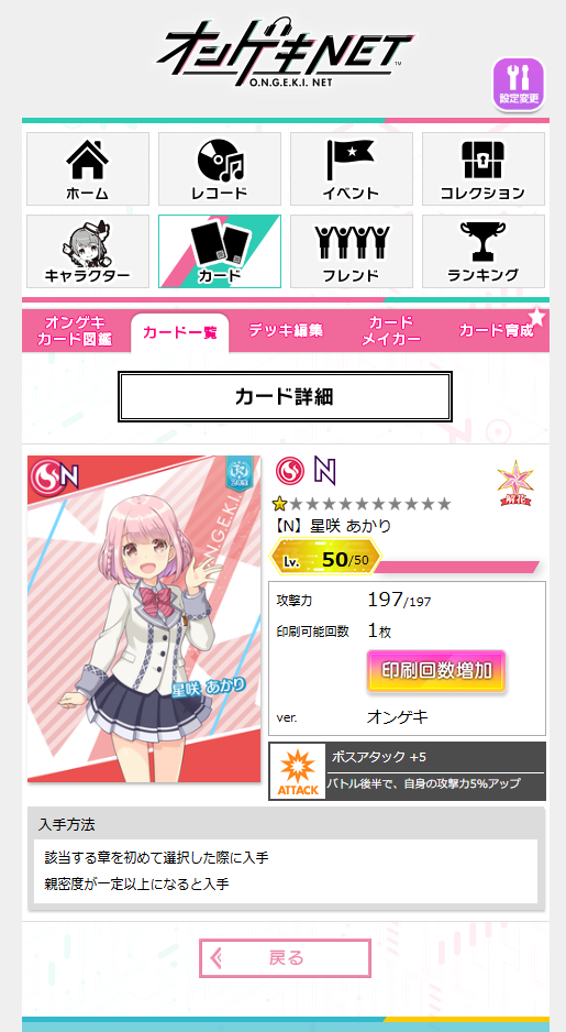 カードの印刷回数はオンゲキ-NETのカード詳細画面から増やすことができます。