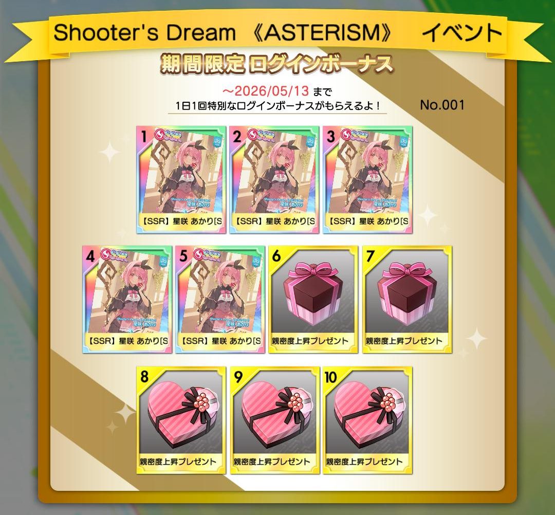 | 5日目 | 【SSR】星咲 あかり[Shooter’s Dream 《ASTERISM》] |